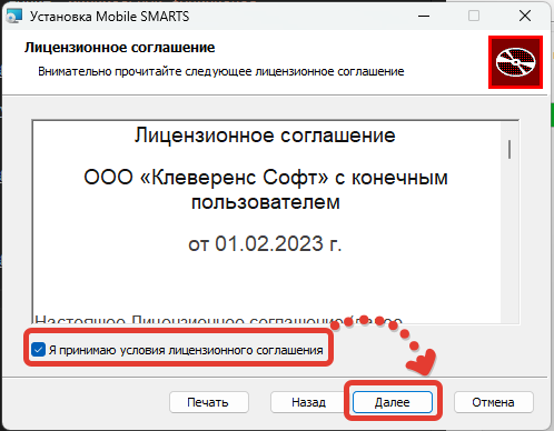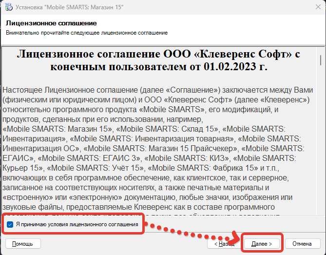 Ознакомьтесь с лицензионным соглашением, включите опцию Я принимаю условия лицензионного соглашения и нажмите Далее
