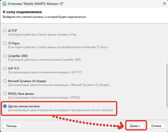 На странице "К чему подключаемся" необходимо выбрать пункт Другая учетная система и нажать Далее.