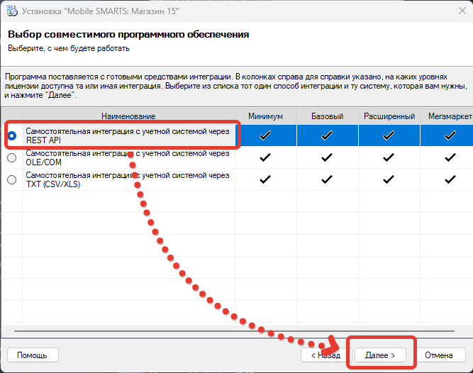На странице "Выбор совместимого программного обеспечения" необходимо выбрать пункт Самостоятельная интеграция с учетной системой через REST API и нажать Далее