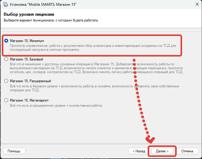 На странице "Выбор уровня лицензии" выберите пункт Магазин 15. Минимум и нажмите Далее