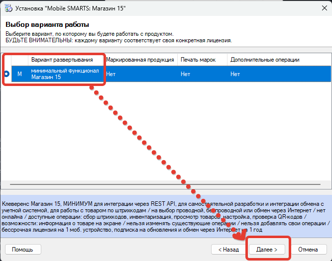 На странице "Выбор варианта работы" выберите пункт минимальный функционал Магазин 15, затем нажмите Далее