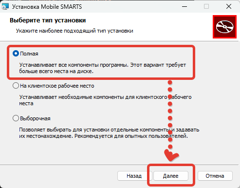На странице "Выберите тип установки" выберите вариант Полная и нажмите Далее, чтобы продолжить.