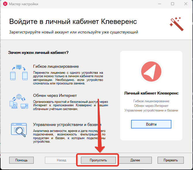 На странице "Войдите в личный кабинет Клеверенс" вы можете войти в учетную запись или пропустить этот шаг, если учетной записи нет и вы не планируете ее регистрировать.