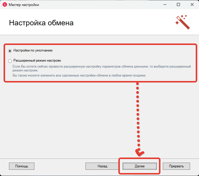 На странице "Настройка обмена" выберите пункт Настройки по умолчанию. При необходимости вы сможете изменить настройки позже. Затем нажмите Далее