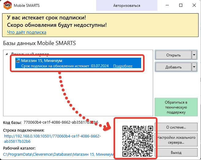 В списке выберите базу данных или создайте новую. Затем отсканируйте QR-код с помощью мобильного приложения "Магазин 15" на терминале сбора данных.